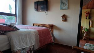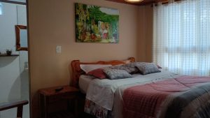 La habitación cuenta con una cama doble, con lencería que aportan confort. La habitación cuenta con una mesa de noche y un armario, decorada con toque artístico al ambiente. La habitación cuenta con televisión y tiene una ventana con vista a la calle que brinda buena iluminación natural. Además, es importante resaltar que la habitación dispone de un baño privado, accesible desde la propia habitación, garantizando privacidad y comodidad para los huéspedes